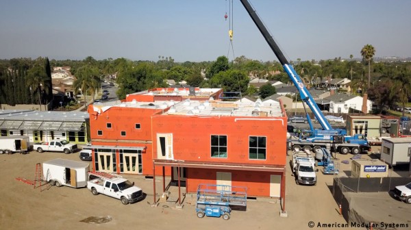 WrapShield SA Self-Adhered WRB/Air Barrier (orange) was installed on 9 modules at the American Modular Systems factory in Manteca, CA before being delivered to their final location in Long Beach, CA.